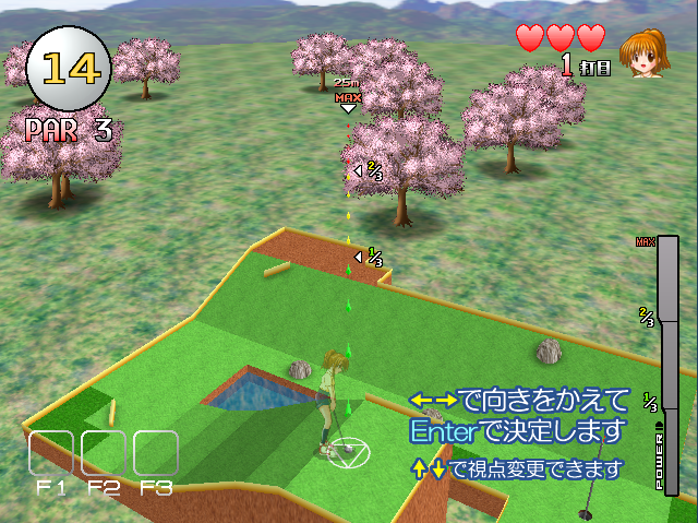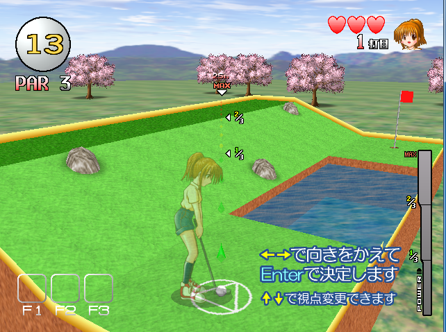 坂の上にカップがある。しかしその坂がコンクリートで出来てるうえ、そのカップ周辺しか平面がないためパワーがちょっとでも強いと、坂を転がって池ポチャになる。