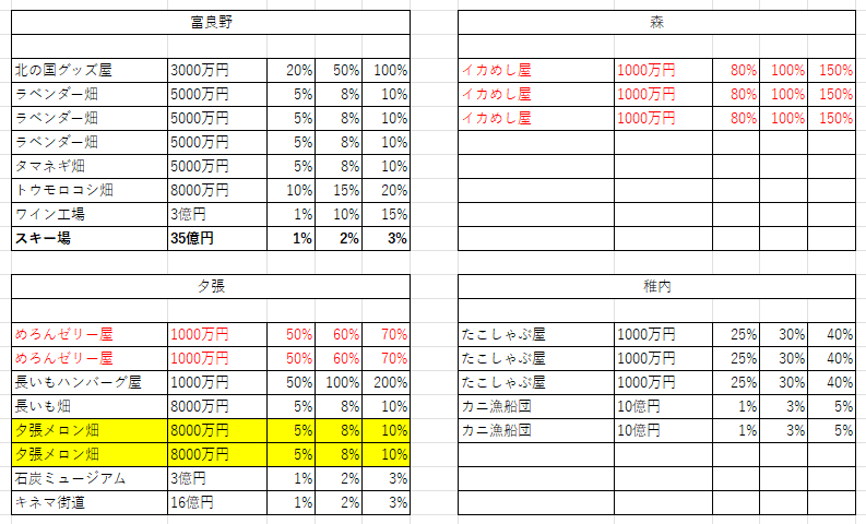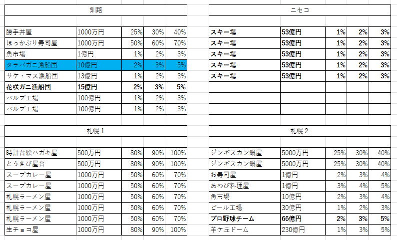 地味に重要な点だが、釧路のタラバガニ漁船団を持っていると四国南に北海道があるときに出現する「タラバガーニ(物件駅以外で高確率で出現し、持っている物件を破壊する)」が現れなくなるので買っておきたい。