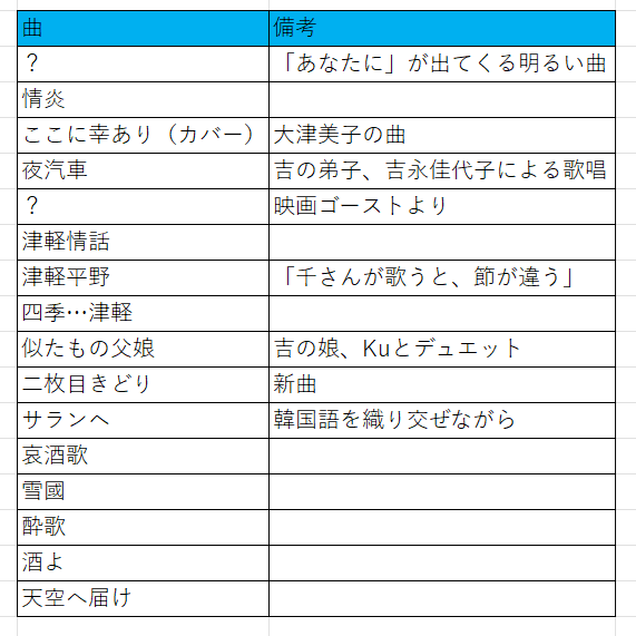 セトリはこんな感じ。一部曲名が分からなかったが、有名どころは分かった。